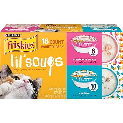 Give your cat another reason to bound for her bowl with Purina Friskies Lil Soups wet cat food complement with Tuna in a Velvety Chicken Broth. Save 30 Off Autoship Save. Made With Real Salmon.